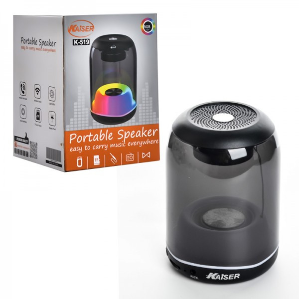 اسپیکر بلوتوثی رم و فلش خور کایزر (KAISER) مدل K-519 یک گزینه مناسب برای استفاده در محیطهای باز یا داخلی است. این اسپیکر با طراحی جمعوجور و وزن کم، حملونقل آسان را فراهم میکند.این اسپیکر از یک بلندگو با توان صوتی 3 وات را ارائه میدهد. اتصال به دستگاهها از طریق بلوتوث امکانپذیر است و برد آن تا 10 متر است. همچنین، این اسپیکر دارای ورودیهای مختلف مانند AUX برای اتصال به دستگاههایی که قابلیت بلوتوث ندارند، و همچنین پشتیبانی از رم TF یا فلش مموری برای پخش مستقیم موسیقی از کارت حافظه است. یکی از ویژگیهای جذاب این اسپیکر چراغهای RGB آن است که محیط اطراف را با نورهای رنگارنگ روشن میکنند و تجربه صوتی شما را لذتبخشتر میکنند. دکمهها روی بدنه اسپیکر قرار دارند که کنترل پخش موسیقی و تنظیمات دیگر را سادهتر میکنند.